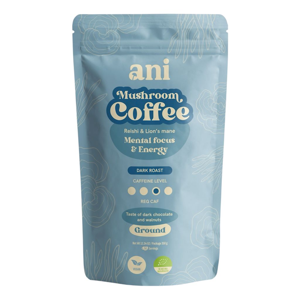 Suplement diety. Kawa arabica z ekstraktem z grzybów: reishi (Ganoderma lucidum) i lion's mane (Hericium erinaceus).
