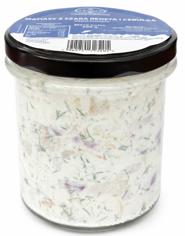 Dodatek jabłek odmiany szara reneta wprowadza naturalną, lekko kwaskową nutę, która doskonale balansuje tłustość matjasa i kremowość śmietany. Cebula dodaje subtelnej wyrazistości, a koperek, miód i przyprawy (gorczyca, ziele angielskie, liść laurowy, pieprz) budują pełny, tradycyjny profil smakowy. Całość zanurzona jest w delikatnym sosie śmietanowym z dodatkiem octu jabłkowego – dzięki czemu smak jest harmonijny, lekko słodko-kwaśny i bardzo domowy.
