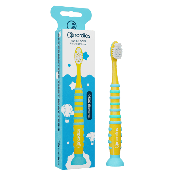OPIS Ta szczoteczka do zębów jest odpowiednia dla dzieci w wieku powyżej 4 lat. Ma największą liczbę super miękkich włókien - 10500. Rączka posiada silikonowe części, które ułatwiają chwyt i posiada przyssawkę. W górnej części główki znajdują się dłuższe włókna, które ułatwiają dotarcie do tylnej części zębów.